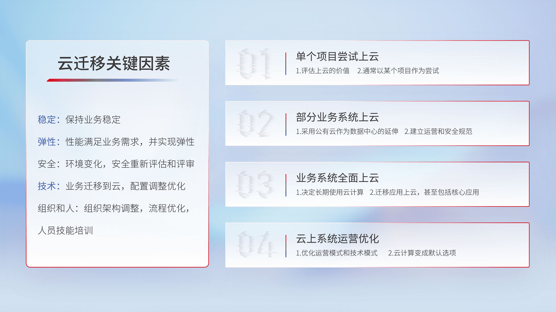结合实际业务,,从规划设计、、云平台选型、、、云原生改造、、、、数据迁移、、集成交付,,,,迁移全过程为客户识别最佳上云路径,,,,做好风险识别管理,,,设计网络架构、、、、身份权限、、、安全审计合规、、、操作审计、、、、日志审计、、、监控告警策略、、、、多站点容灾设计等,,,对云上基础设施进行整体规划,,提升IT治理水平,,,以满足弹性、、、高可用、、高性能的需求。。