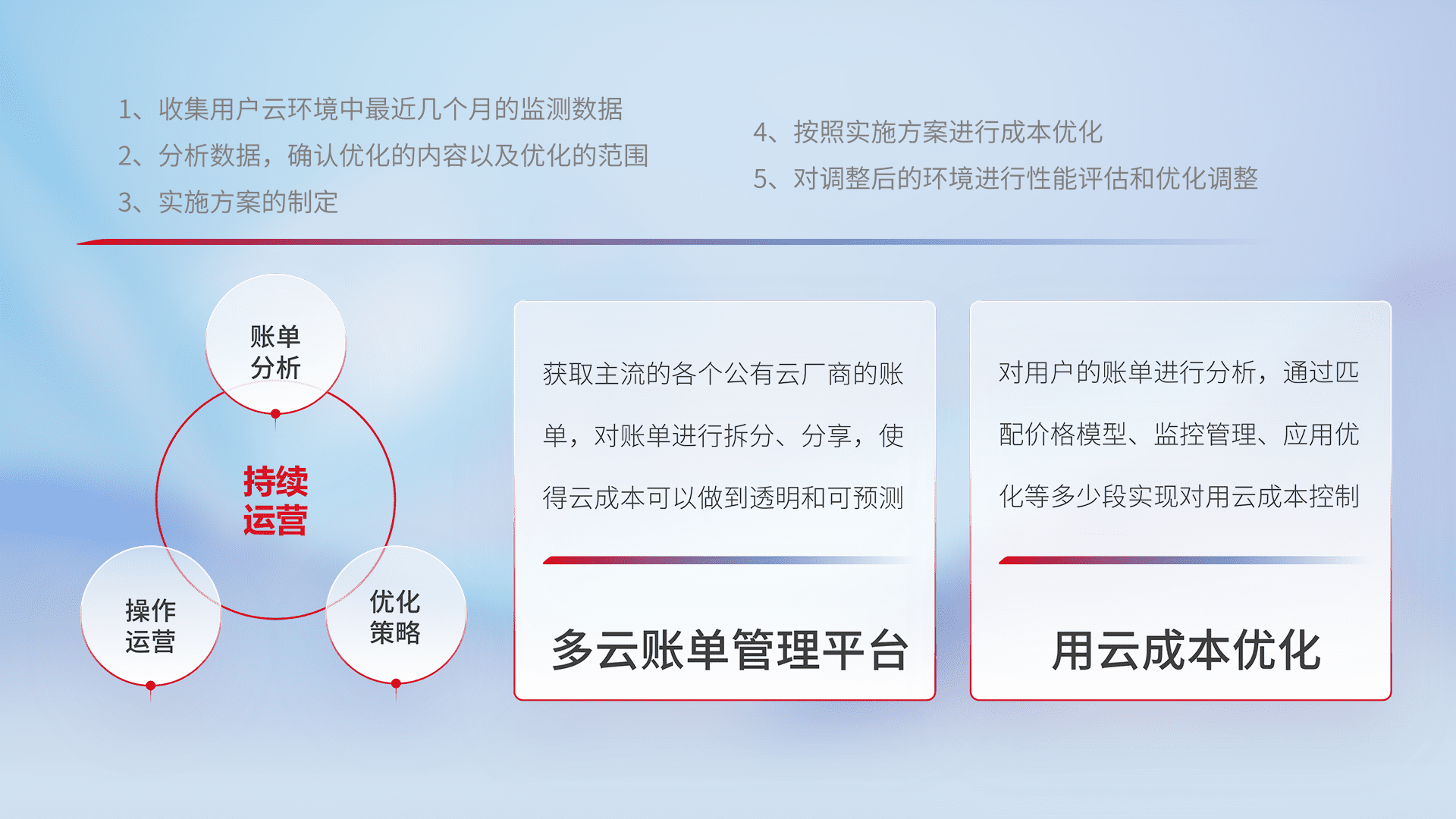 通过多云纳管,,以统一的资源数据模型把客户的云资源进行抽象和封装,,,进而实现对多云资源的统一操作,,,保障云资源管理的可靠性、、稳定性与可用性。。量身定制化运维内容,,,配置、、、开发运维、、、、补丁管理、、、、备份、、监控、、、、认证和访问管理、、、、审计和日常巡检等,,,,保障在用云过程中的可靠度,,,稳定度以及高可用率。。