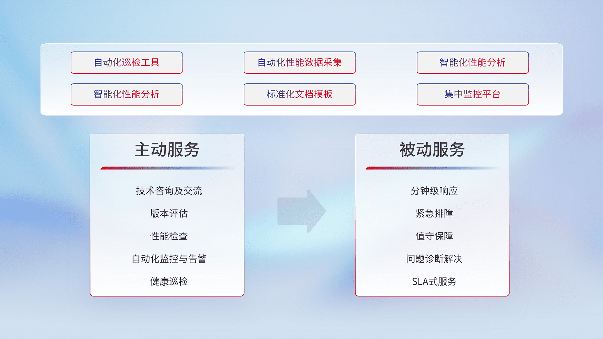 智能化工具和标准化文档,,,,保障服务质量,,,,提供主动服务(包含技术咨询、、、、版本评估、、、、性能检查、、、、自动化监控与告警、、、健康巡检)和被动服务包含(分钟级响应、、、、紧急排障、、值守保障、、、问题诊断解决、、、、SLA服务)。。。