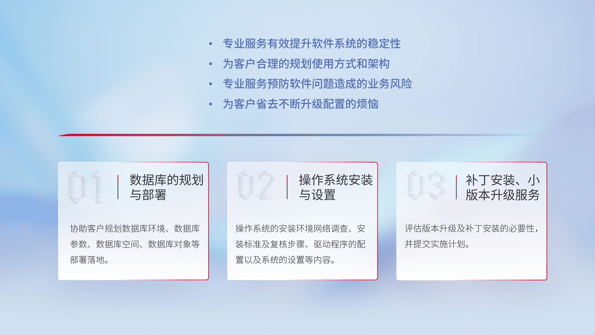 为客户提供软件规模升级、、、、快速部署、、、按需配置的专业服务,,,,从数据库的规划与部署到操作系统的安装与设置,,再到补丁安装和小版本升级提供支持。。。